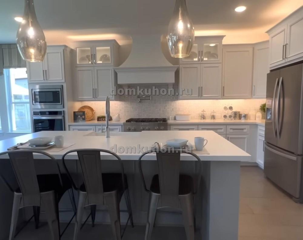 Представляем вашему вниманию кухню "Фьюжен" — сочетание изысканности и современного стиля. Этот гарнитур окрашен в светло-серый цвет, что придает интерьеру свежесть и легкость. Остров с обеденной зоной оборудован столешницей из натурального камня, которая не только эстетично выглядит, но и обеспечивает долговечность и удобство в уходе. Изящные подвесные светильники добавляют интерьеру ощущение пространства и роскоши. Эта кухня идеально впишется в жизнь тех, кто ценит комфорт, качество и хочет сделать акцент на элегантности своего дома. "Фьюжен" — это не просто кухня, это место, где создаются воспоминания, вдохновляются на кулинарные шедевры и собирается вся семья.